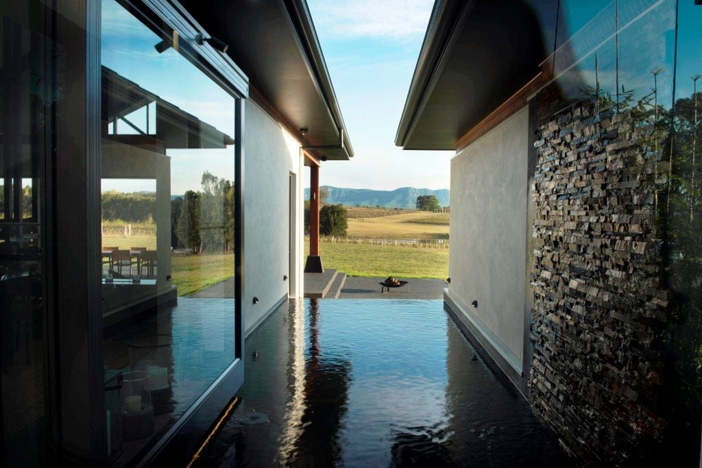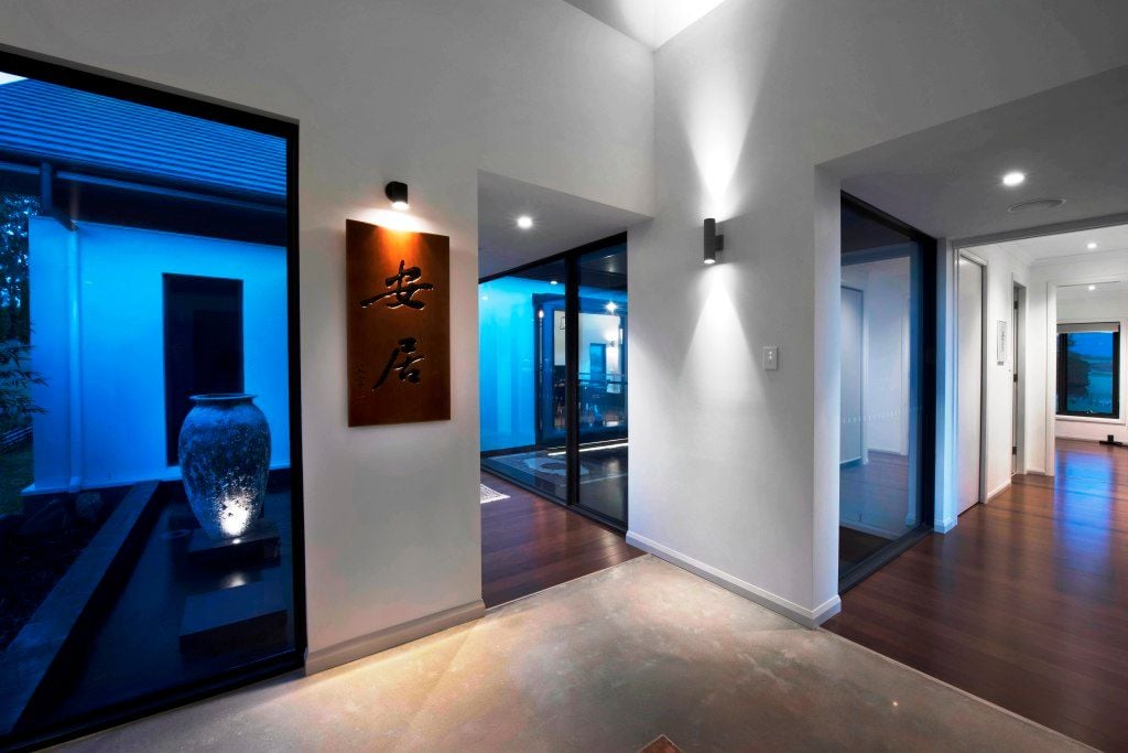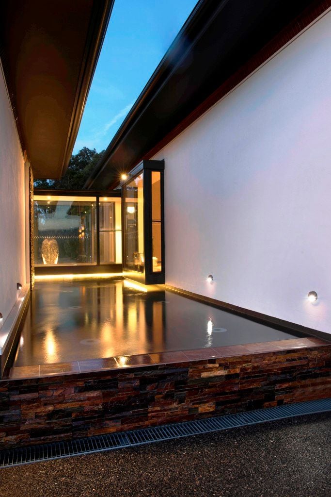 Large fixed panels of glass over look courtyard water features, creating a sense of calm and tranqulity throughout the house.