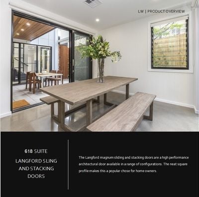 Custom made sizes to suit your requirement's. The architectural frame gives the door a high wind and water rating. A large variety of combinations are available including 4 door (1 fixed 3 sliding), cavity sliding and corner opening without a center post.